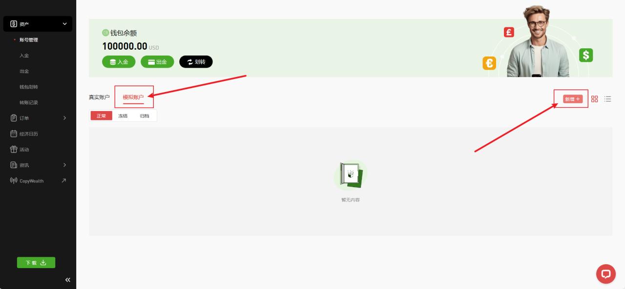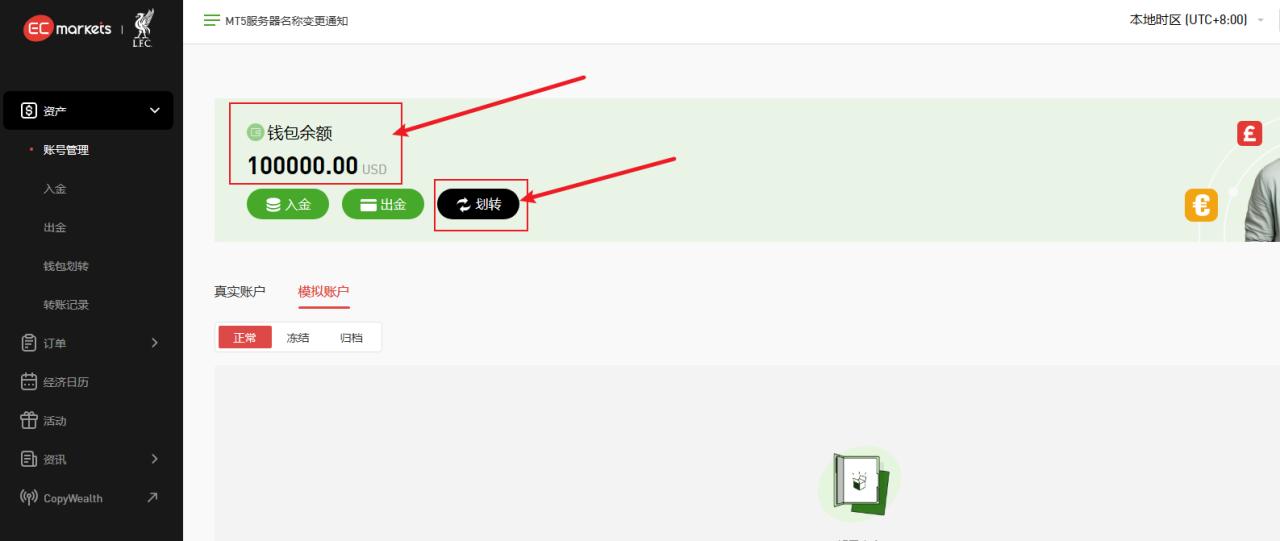 第三步:入金成功后资金是在后台的钱包余额里面,需要进行划转到交易账户,才能进行交易